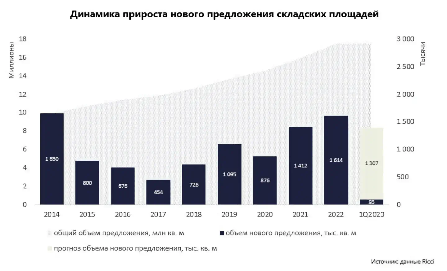 В 2023 году рынок складского строительства демонстрирует заметный сдвиг: до 70% объектов, которые планируется ввести в эксплуатацию по итогам года, относятся к спекулятивным. При этом активность девелоперов в первые месяцы года выглядит осторожнее, чем год назад: к середине марта введено 93 000 м² качественных складских площадей, что, по оценке Ricci, более чем в два раза ниже показателя прошлого года.
